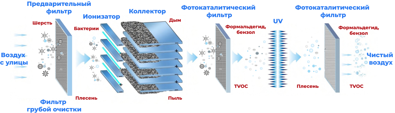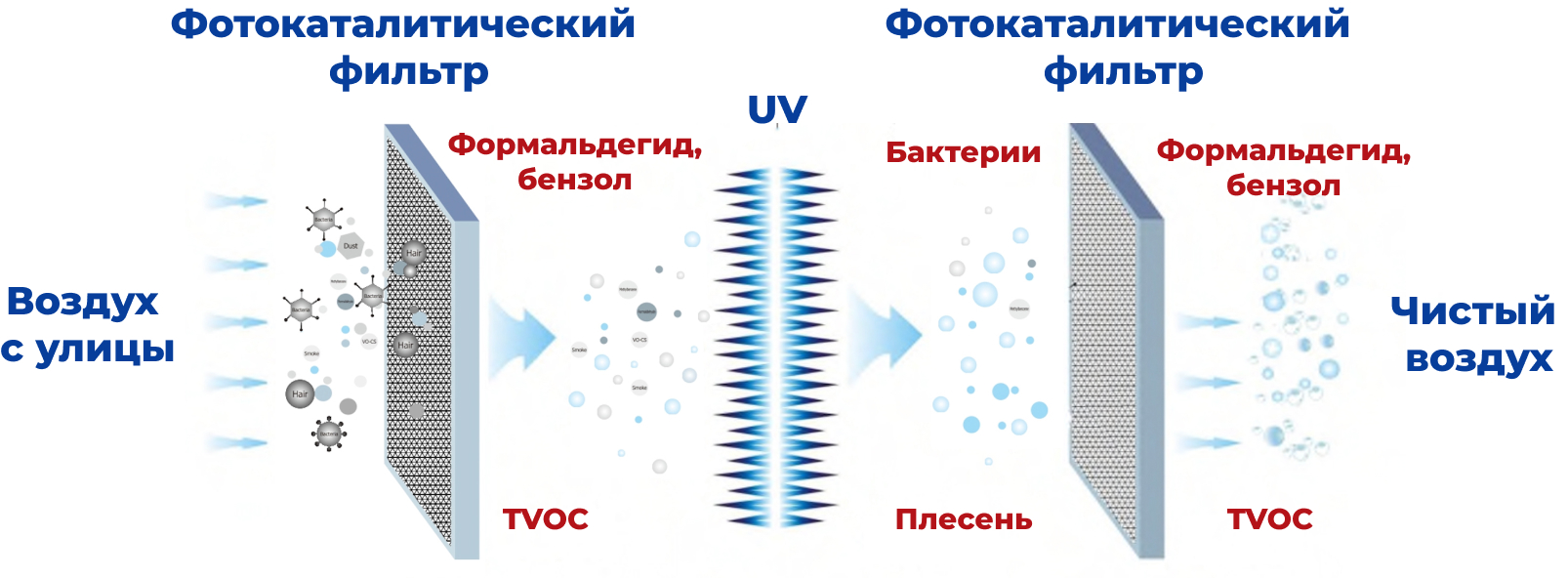 действием ультрафиолетового света, который может разлагать вредные газы, такие как формальдегид, бензол, TVOC