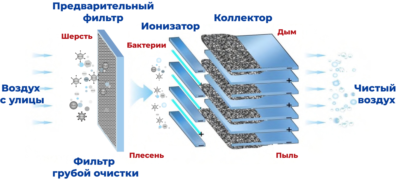 4000 В, частицы микроорганизмов, пыль и дым из воздуха абсорбируются, тем самым полностью очищая воздух.